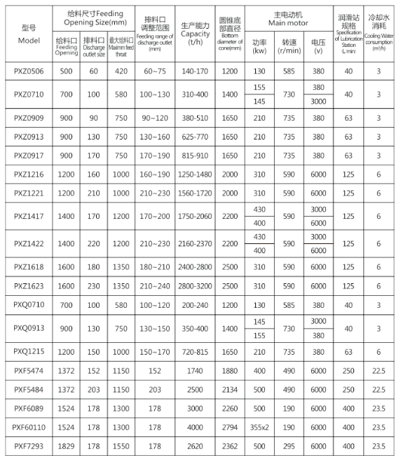 我廠設計、制造旋回破碎機有十多年歷史,生產的旋回破碎機有PXZ(重型)、PXQ(輕型)和PXF(引進)三個系列,其中PXZ系列用于破碎中等或中等以上硬度的各種物料,PXQ系列用于破碎中等或中等以下硬度的各種物料,PXF系列用于大型露天礦山和選礦區應用范圍: